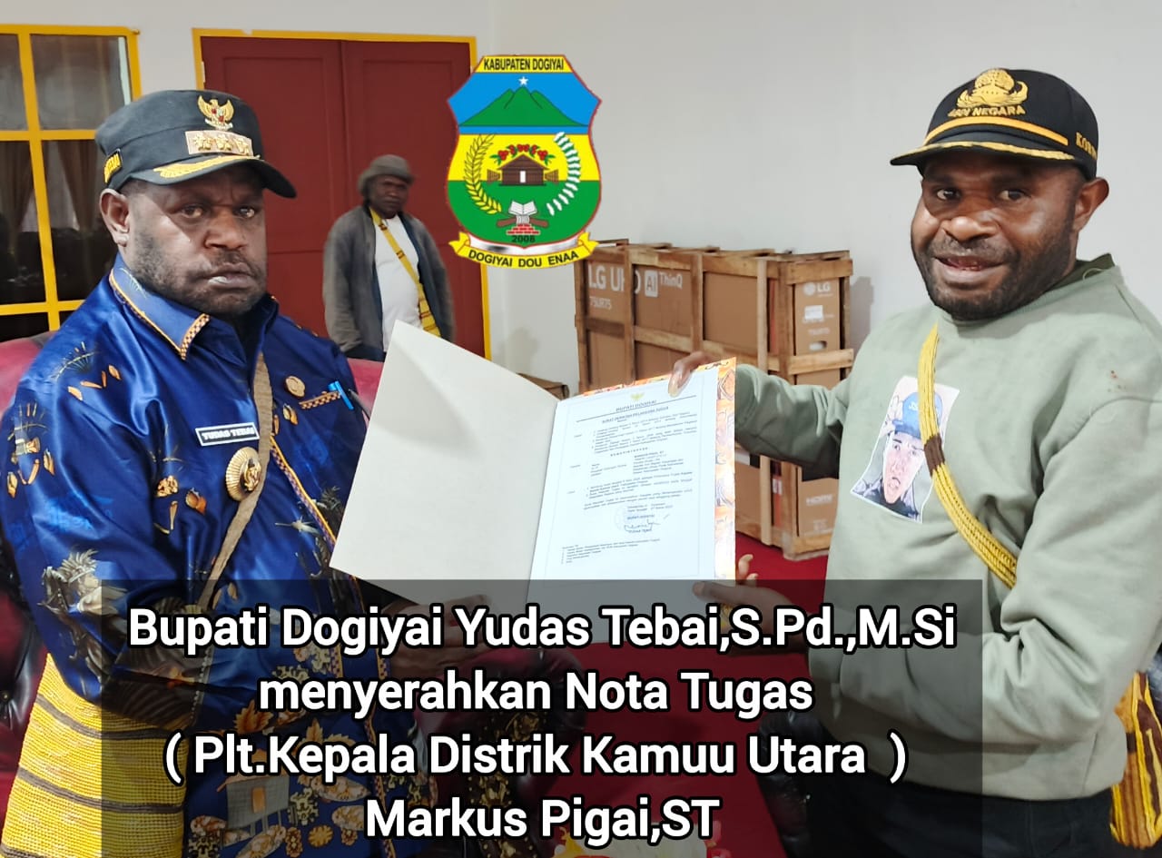 DOGIYAI- BUPATI YUDAS & YULITEN, News. Dalam upaya meningkatkan kinerja dan menyegarkan birokrasi Bupati Dogiyai Yudas Tebai,S.Pd.,M.Si secara resmi menyerahkan Nota Tugas kepala distrik Kamuu Utara kepada Markus Pigai, S.T pada Jumat (11 Juli 2025), di Kediaman Bupati Tokapo,Moanemani,Dogiyai.