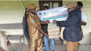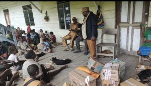 Foto: Bupati Dogiyai mengerahkan Bantuan Kepada Masyarakat Sukikai selatan yang langsung terima oleh Kepala distrik, Yosep Kidou dari depan Rumah Mes Kampung Unito, Distrik Sukikai selatan.