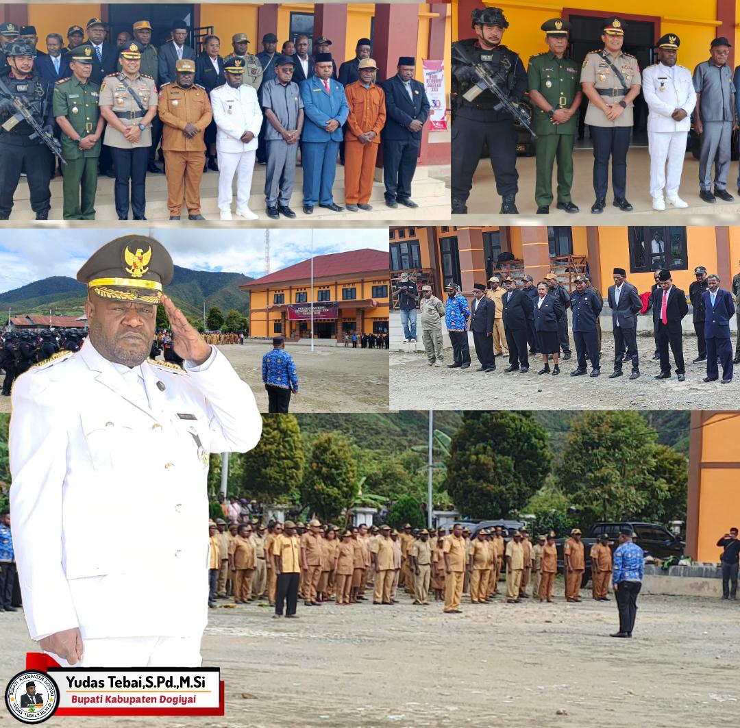 Bupati Kabupaten Dogiyai Yudas Tebai,S.Pd.,M.Si bertindak sebagai Inspektur Upacara.Hadir dalam upacara itu Wakil Bupati Yuliten Anouw,S.Pd.,M.Si,Sekda Dogiyai,Drs.Petrus Agapa,M.Si Forkopimda, Asisten, Staf Ahli, Kepala Organisasi Perangkat Daerah (OPD),TNI POLRI,Koramil serta ASN di lingkungan Pemkab Dogiyai.Kegiatan ini menjadi wujud komitmen bersama dalam memperkuat semangat otonomi daerah.