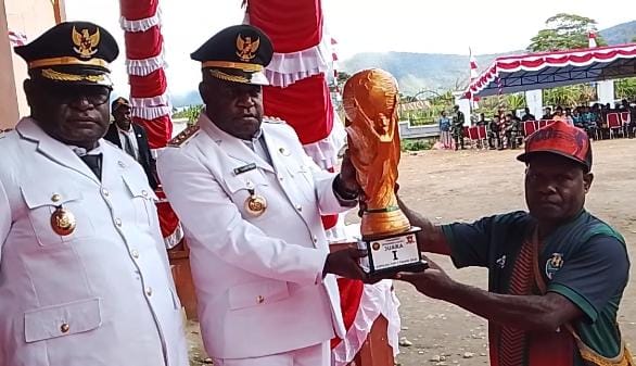 Penyerahan Piala juara 1 Lomba Sepak Bola Kapolda Cup yang dimenangkan oleh Tim DOSA FC ke Bupati Dogiyai